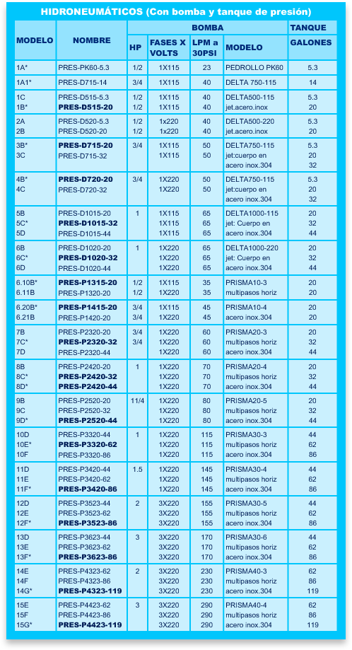 • Los modelos resaltados y marcados con*, son los recomendados. • Todos los presurizadores se surten armados, incluyen: bomba, tanque precargado, switch de presión, manómetro, base para la bomba, conexiones bomba-tanque. • Las bombas PEDROLLO son del tipo "periférica" y tienen cuerpo en hierro fundido, flecha en acero inoxidable 304 e impulsor en bronce. • Las bombas DELTA tienen cuerpo y flecha en acero inoxidable 304 e impulsor y eyector en Noryl. • Las bombas PRISMA tienen cuerpo, flecha e impulsores en acero inoxidable 304 y difusores en Noryl. Son muy silenciosas y eficientes.